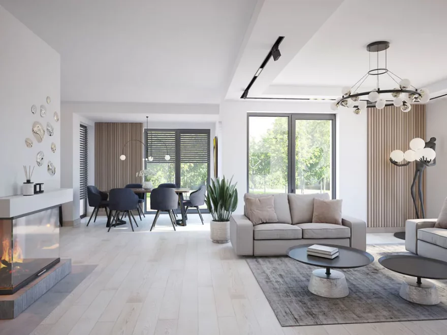 Внутреннее устройство первого этажа поражает своим масштабом. Дневная зона представляет собой открытое пространство, где столовая эффектно выделена в эркере, обеспечивая панорамный обзор на сад. Центральное место занимает камин, который не только дарит уют, но и грамотно зонирует холл и территорию отдыха. Если вы планируете двухэтажный каркасный дом под ключ, то оцените функциональность этого проекта: на нижнем уровне предусмотрены большая кухня с кладовой, полноценная гостевая комната и санузел. Масштабная крытая терраса позволяет с комфортом проводить время на свежем воздухе в любую погоду.