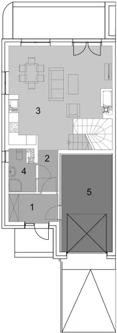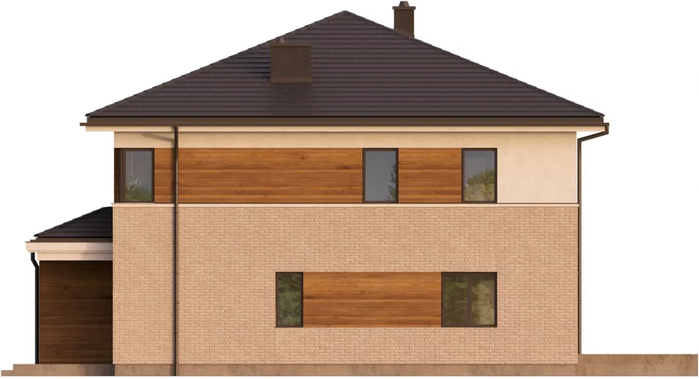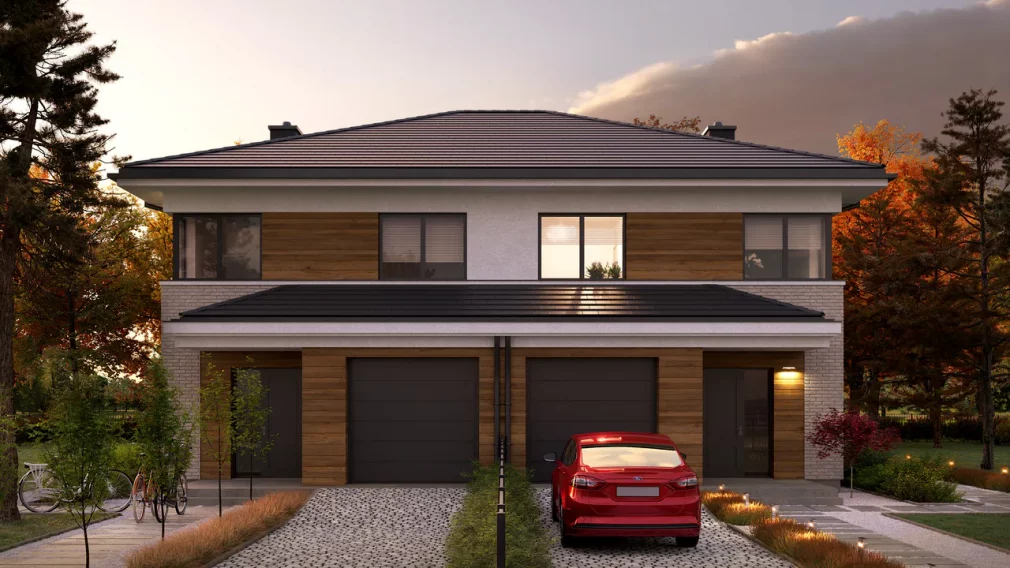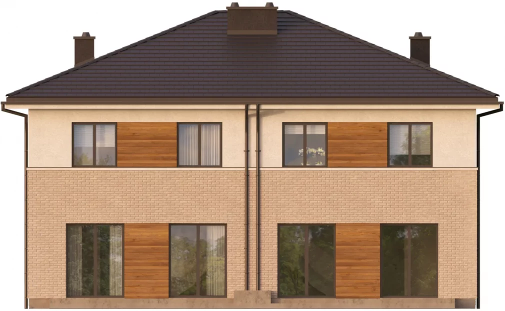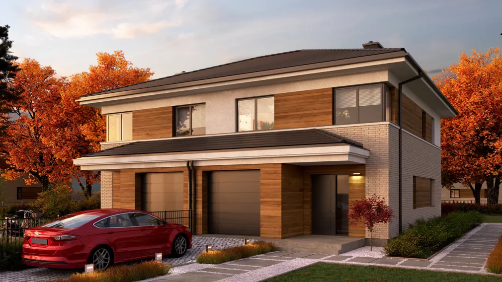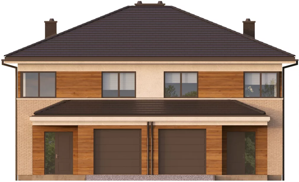 Проект AET-257 — это воплощение практичности и современного стиля в формате дуплекса. Благодаря своей компактной архитектурной форме и лаконичным линиям, этот двухэтажный дом демонстрирует исключительную энергоэффективность. Здание спроектировано таким образом, чтобы обеспечить максимальный жилой комфорт даже на небольших земельных участках. Элегантный внешний вид в сочетании с интегрированным одноместным гаражом делает этот проект отличным выбором для тех, кто ищет баланс между городской функциональностью и загородным уютом.