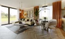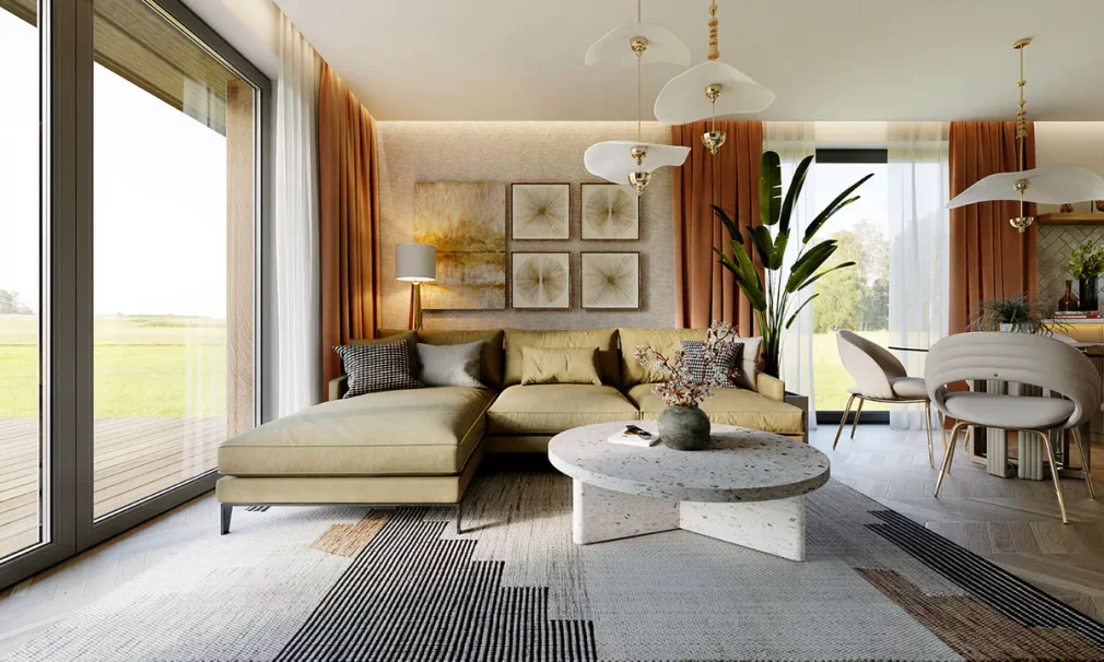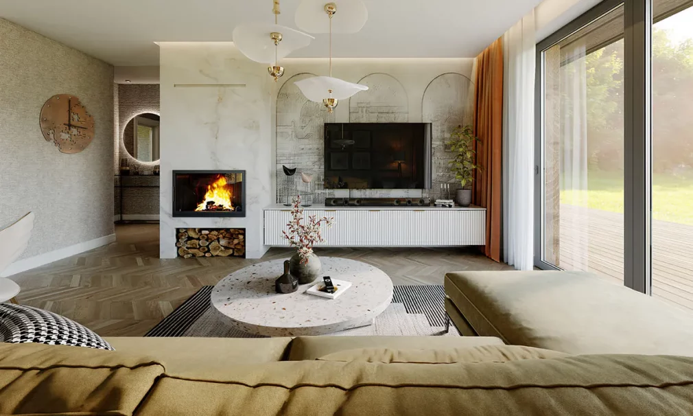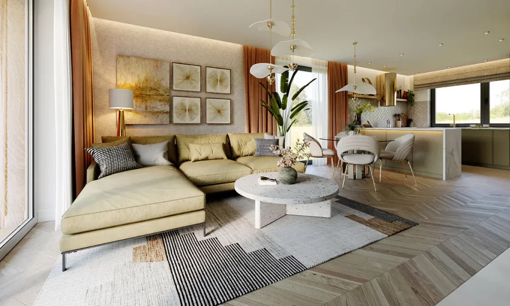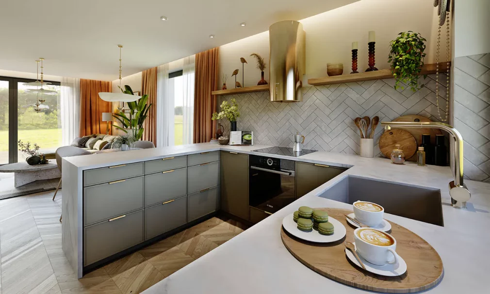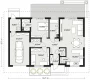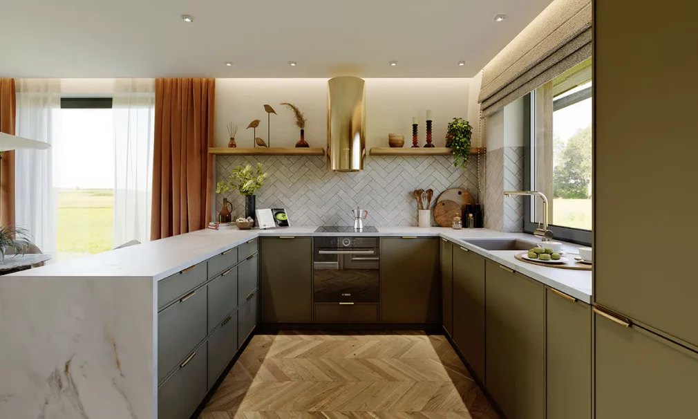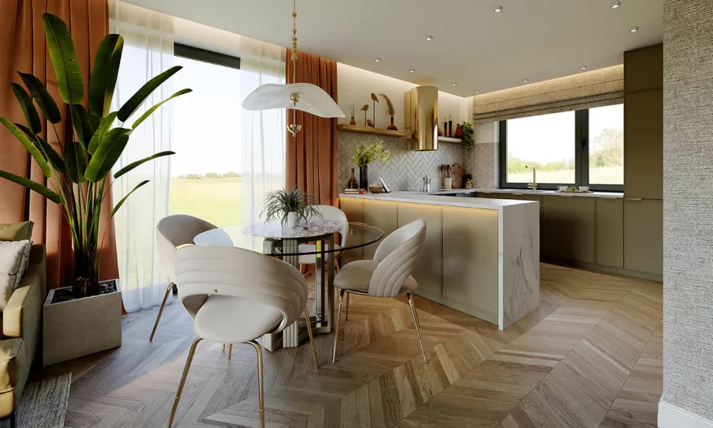 Центральным элементом дома выступает большая гостиная, объединённая со столовой. Это светлая зона, идеально подходящая для семейных вечеров и приёма гостей. Кухня размещена отдельно, но при этом остаётся в визуальной и функциональной связи с общей зоной. Дополнительная кладовая рядом с кухней делает хранение запасов максимально удобным.