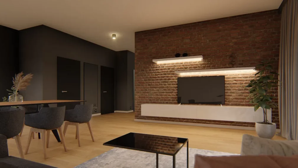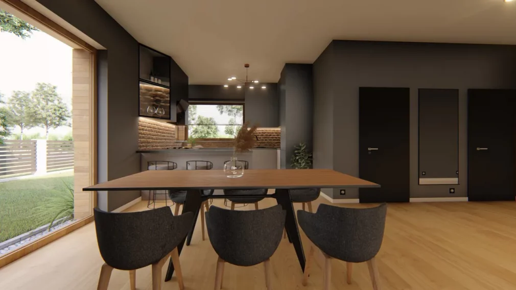 Главным центром притяжения становится большая гостиная, объединённая со столовой. Это идеальное место для семейных ужинов, приёма гостей и отдыха. Кухня вынесена в отдельное помещение, что позволяет сохранить порядок и комфорт в общей зоне, при этом оставаясь в удобной связке с гостиной. Наличие двух санитарных помещений повышает удобство повседневного использования дома, особенно для семьи из нескольких человек.
