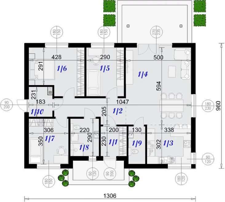 Входная зона с тамбуром формирует удобный барьер от улицы и помогает поддерживать комфортный микроклимат внутри дома. Просторный холл объединяет все помещения и создаёт ощущение открытого, «дышащего» пространства уже с первых шагов. Планировка предусматривает несколько изолированных комнат, которые можно использовать как спальни, детские или кабинет — дом легко адаптируется под разные сценарии жизни.