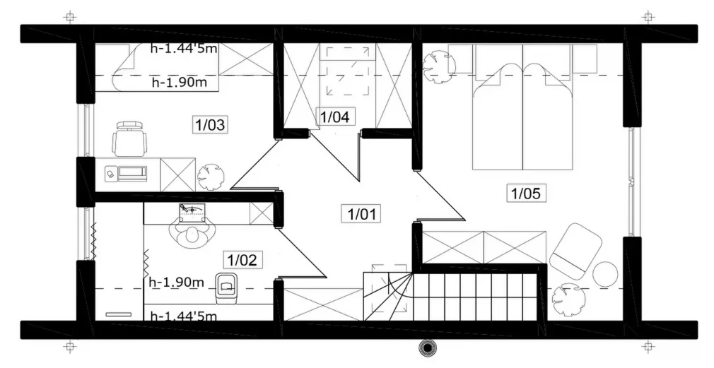 Мансардный этаж расширяет жилую площадь, обеспечивая дополнительные комнаты для сна, работы или отдыха. Продуманная организация коридоров и помещений создаёт удобное движение по дому и комфортное распределение пространства. Высокий угол наклона крыши и оптимальное зонирование обеспечивают хорошее естественное освещение и уютный микроклимат.