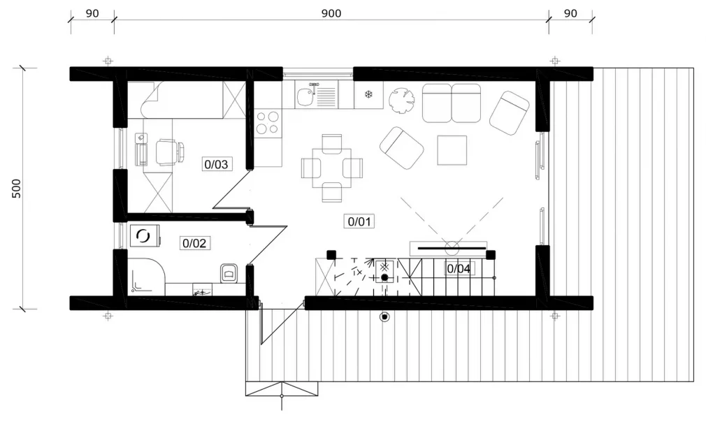 На первом этаже расположена объединённая зона гостиной, кухни и столовой — светлое пространство для совместного времяпрепровождения и приёма гостей. Отдельный санузел и комната повышают комфорт проживания, а лестница ведёт на мансардный этаж, где предусмотрены дополнительные жилые комнаты, санузел и хозяйственное помещение. Такая планировка позволяет эффективно разделить общественную и приватную зоны.