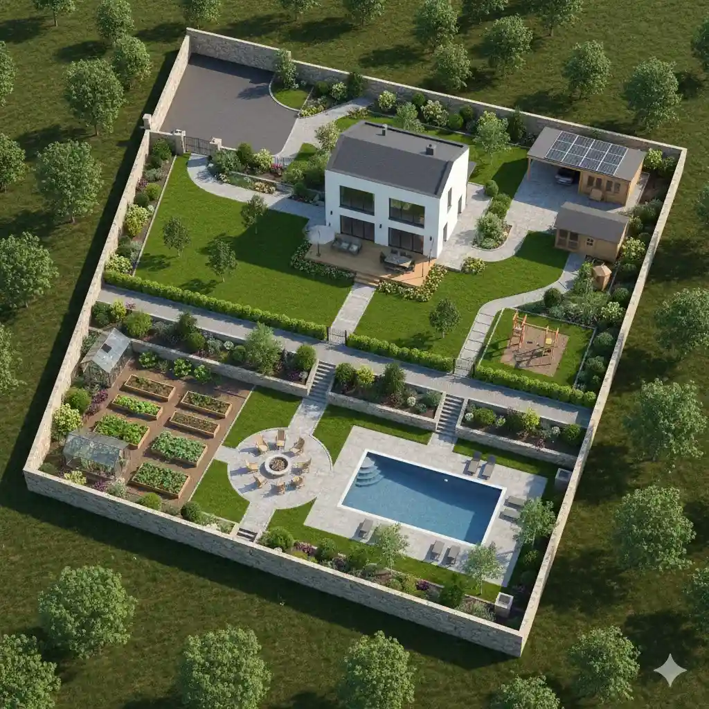 При планировании нужно учитывать, что расположение жилого дома на участке является отправной точкой. Все остальные объекты привязываются к нему. Например, зону отдыха логично разместить рядом с гостиной или кухней, а гараж — ближе к въезду. Грамотные правила расположения дома на участке предполагают, что под застройку уходит около 10–15% площади, под хозблоки — до 5%, а остальное пространство занимают сад и зоны отдыха. Такой баланс позволяет эффективно использовать каждый метр земельного пространства.