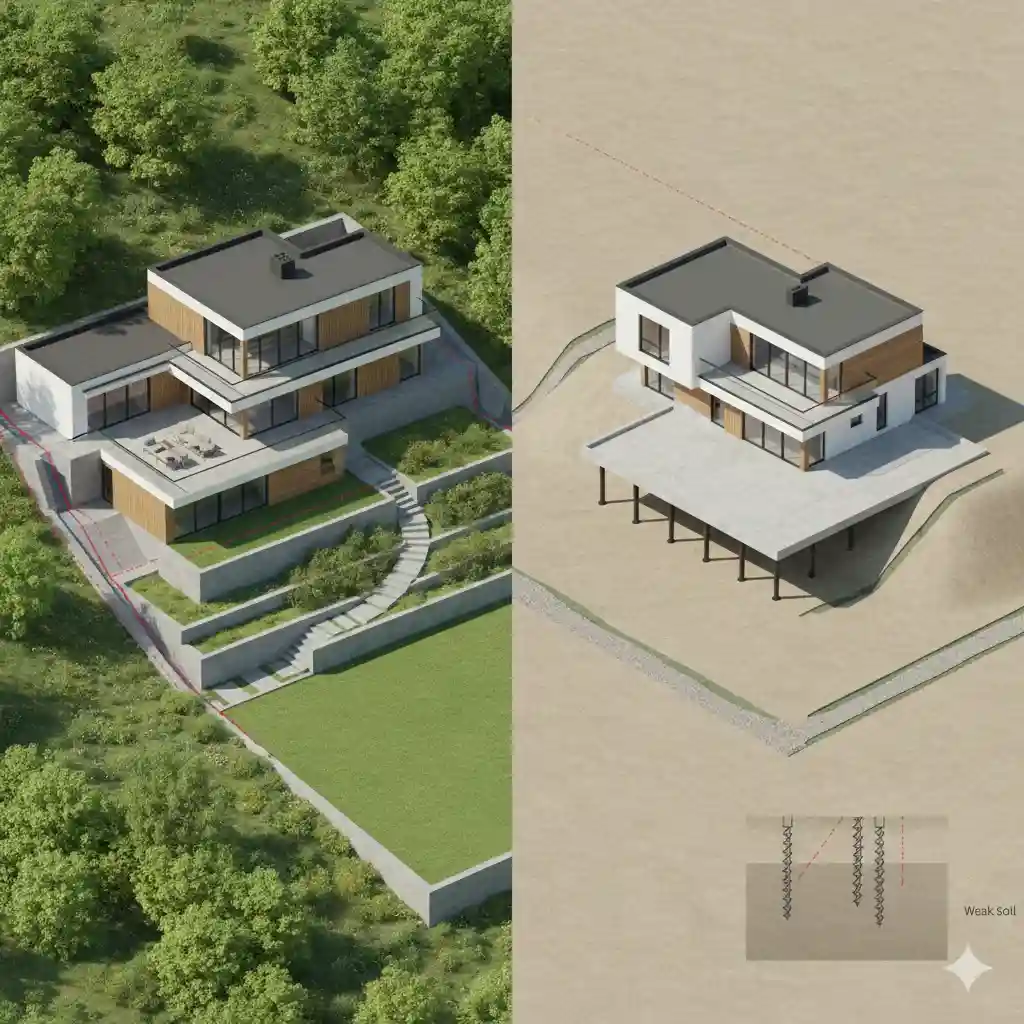 Особенности ландшафта диктуют свои правила, заставляя адаптировать проект под конкретные условия грунта. Оптимальное расположение дома на земельном участке с уклоном — его верхняя точка. Это гарантирует естественный отвод ливневых вод и защиту фундамента от подтопления. На плоских рельефах поставить дом на участке проще, однако нужно заранее предусмотреть небольшой искусственный подъем для исключения застоя влаги.